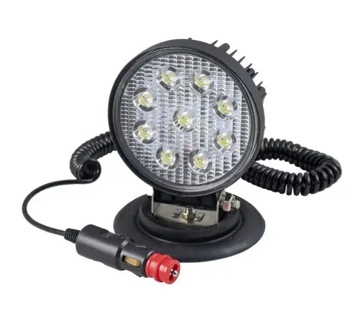 9 LED-es kerek munkalámpa, terítő fénnyel, szuper erős MÁGNESTALPPAL és szivargyújtós kábellel.