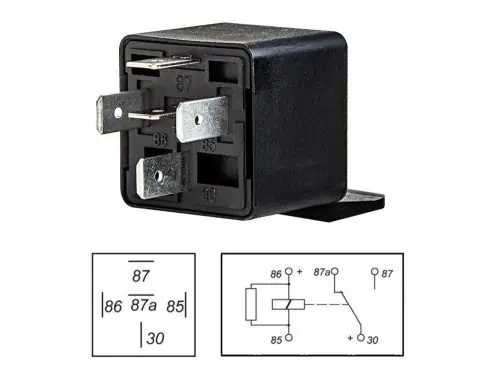 24 V-os 5 lábú váltó relé tartófüllel.Egyszeres váltóérintkezővel.Terhelhetőség: 20/10 A (kapcsolt/nyugvó)Bekötését lásd az ábrán!